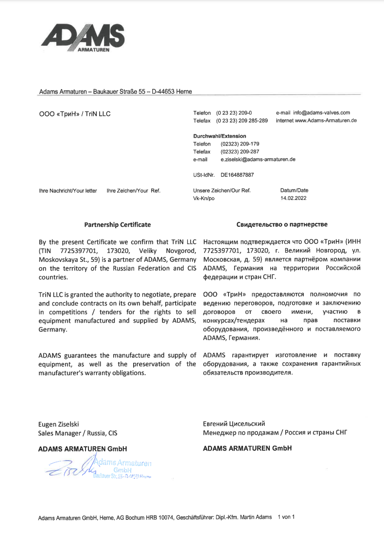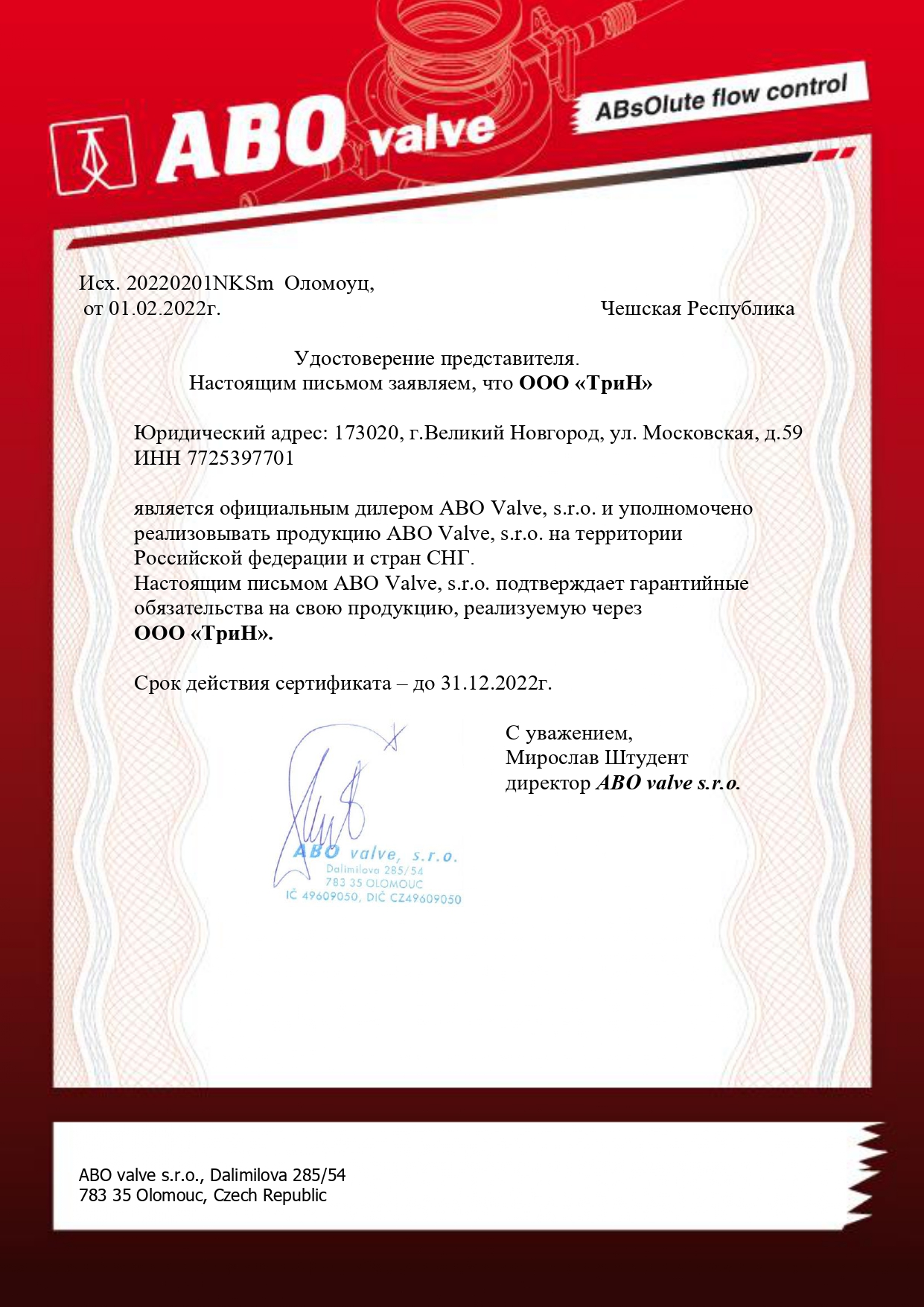 Сертификат дилера подтверждает право на реализацию продукции АВО на территории РФ и стран СНГ, а также гарантийные обязательства на продукцию, реализуемую через ООО "ТРИН"